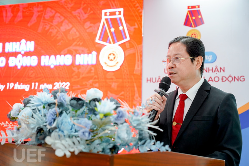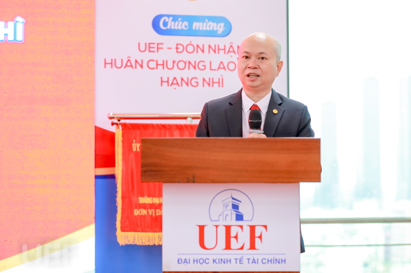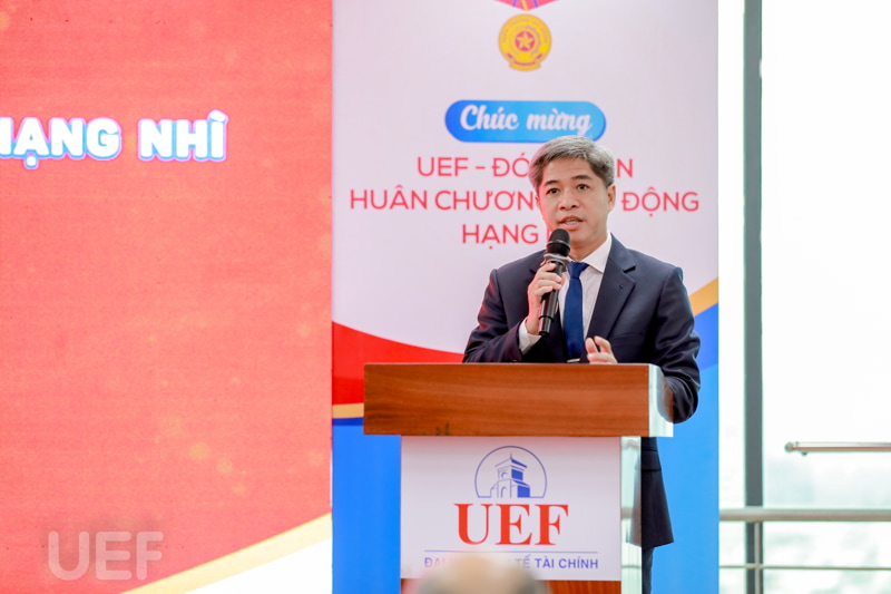 Tại buổi lễ, TS. Nguyễn Xuân Trường – Giám đốc Trung tâm Phát triển giáo dục và đào tạo phía Nam đã gửi lời chúc mừng Nhà trường: “UEF là trường luôn không ngừng đổi mới, nâng cao chất lượng đào tạo; đổi mới, sáng tạo trong quản lý, nghiên cứu khoa học, coi trọng hợp tác doanh nghiệp và đẩy mạnh công tác quốc tế hóa, số hóa toàn diện. Nhà trường đã đạt chuẩn kiểm định quốc tế QS Stars 4 Sao và trở thành thành viên của Tổ chức kiểm định ACBSP - Hoa kỳ trong năm 2022 này. UEF cũng là trường thứ 2 của cả nước đạt kiểm định cấp cơ sở, cấp chương trình đào tạo theo các bộ tiêu chuẩn mới và các quy định khắt khe của Bộ GD-ĐT. Với những kết quả và nỗ lực như trên, việc Nhà trường được Chủ tịch nước quyết định trao tặng phần thưởng cao quý là Huân chương Lao động hạng Nhì vì đã có thành tích xuất sắc trong công tác nghiên cứu khoa học và đào tạo nguồn nhân lực ngành Kinh tế - Tài chính, góp phần vào sự nghiệp xây dựng chủ nghĩa xã hội và bảo vệ Tổ quốc là hoàn toàn xứng đáng. Một lần nữa chúc mừng Nhà trường với sự phát triển luôn bền vững và chắc rằng trường sẽ còn đạt được nhiều thành tựu cao quý hơn trong thời gian tới”.