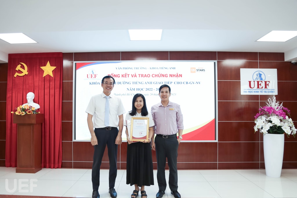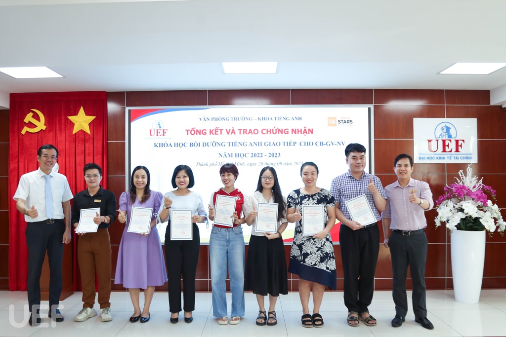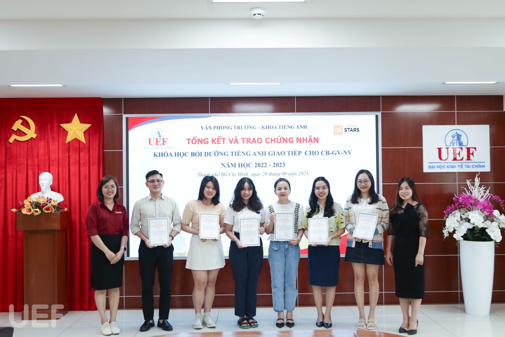 Chiều 20/9, UEF đã tổ chức Lễ tổng kết và trao giấy chứng nhận hoàn thành khóa học bồi dưỡng tiếng Anh giao tiếp năm học 2022 - 2023 cho các cán bộ, giảng viên, nhân viên (CB-GV-NV) Nhà trường.