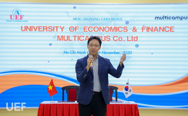 Đại diện Multicampus, ông Lee Chang Won - Tổng Quản lý chi nhánh Công ty Multicampus tại Việt Nam thể hiện mong muốn hợp tác cùng UEF trong việc thực hiện sứ mệnh giáo dục, nâng cao chất lượng đào tạo, tạo cơ hội cho các bạn sinh viên học tập và trau dồi thêm hiểu biết về ngôn ngữ và văn hóa Hàn.