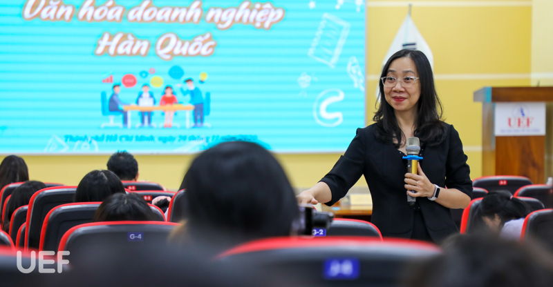 Ngay sau phần lễ ký kết MOU, sinh viên UEF đã có dịp tìm hiểu về văn hóa doanh nghiệp Hàn Quốc với sự chia sẻ của diễn giả Nguyễn Ngọc Diệp. “Doanh nghiệp cần gì ở sinh viên?” hay “Thái độ khi đi làm tại các doanh nghiệp Hàn Quốc?” là những câu hỏi đã được vị Quản lý bộ phận nhân sự với hơn 5 năm kinh nghiệm làm việc tại Samsung giải đáp trong chương trình. Diễn giả Ngọc Diệp nhấn mạnh: ngoài năng lực về kiến thức, điều cốt lõi là các bạn cần hiểu về công việc mình đang làm cũng như không ngừng tích lũy cho bản thân những kỹ năng cần thiết.