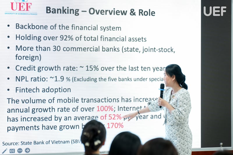 Trong chương trình, ThS. Lưu Thị Ngọc Quỳnh - Giảng viên Khoa Tài chính - Kế toán đã có phần trình bày xoay quanh bức tranh toàn cảnh của thị trường tài chính Việt Nam. Diễn giả nhấn mạnh rằng trong hơn một thập kỷ qua, hệ thống tài chính Việt Nam đã có những bước chuyển mình mạnh mẽ nhờ cải cách kinh tế, tiến trình hội nhập toàn cầu và sự phát triển của công nghệ số. Bên cạnh sự phát triển đó, thị trường cũng đối diện với nhiều thách thức từ gia tăng nợ xấu, khoảng trống pháp lý cho đến áp lực cạnh tranh quốc tế, song song là những cơ hội lớn đến từ nền kinh tế tăng trưởng ổn định, sự mở rộng tín dụng và xu hướng dịch chuyển sang kinh tế số.