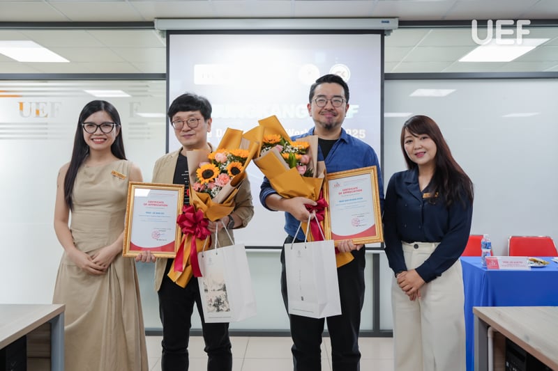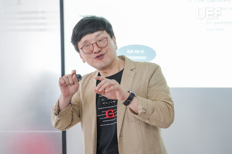 Chia sẻ với sinh viên UEF trong chương trình là các giáo sư đến từ Trường Đại học ChungKang gồm GS. Lee Bum Ro và GS. Son Byung Hyuk. Với nhiều năm kinh nghiệm trong nghiên cứu, phát triển và thiết kế game, các diễn giả đã mang đến kiến thức chuyên sâu, câu chuyện thực tiễn sinh động, khơi dậy niềm đam mê sáng tạo và truyền cảm hứng cho người học. Qua đó, sinh viên có thêm góc nhìn toàn diện về xu hướng công nghệ hiện đại và cơ hội nghề nghiệp trong ngành công nghiệp game đang phát triển mạnh mẽ.