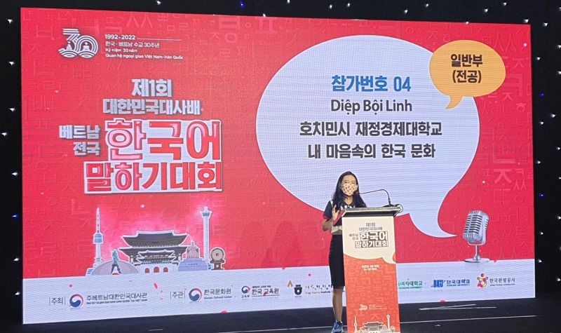 Tiếp nối thành tích trên, vào ngày 20/3, bạn Diệp Bội Linh – Sinh viên năm 3 ngành Ngôn ngữ Hàn Quốc đã xuất sắc giành giải Quán quân tại vòng Bán kết phía Nam của cuộc thi “Nói tiếng Hàn – Cúp Đại sứ Hàn Quốc lần 1”. Đây là cuộc thi nhân kỷ niệm 30 năm thiết lập quan hệ ngoại giao Hàn - Việt.