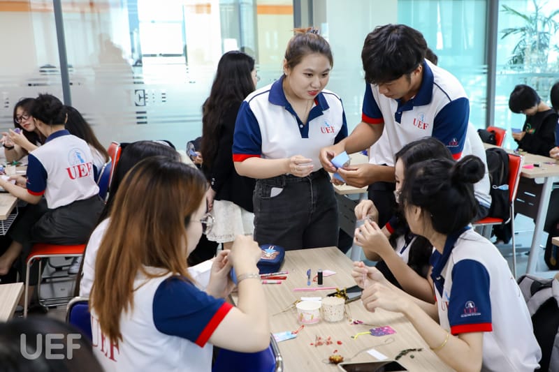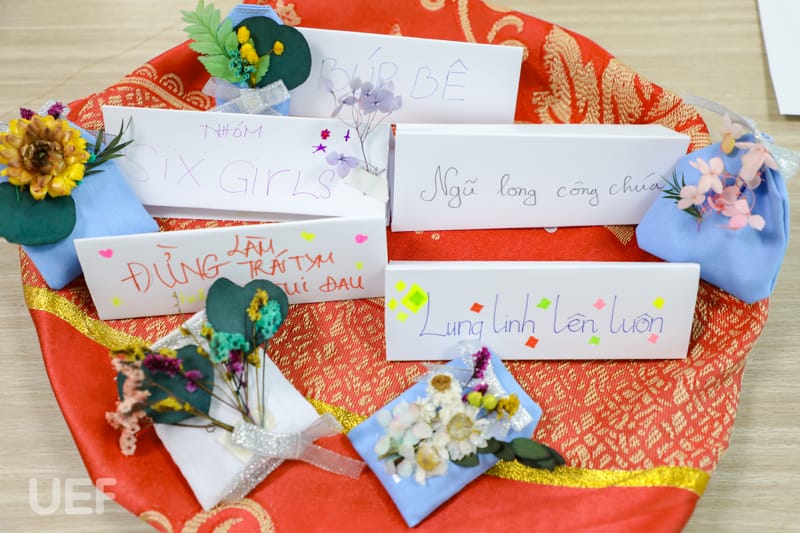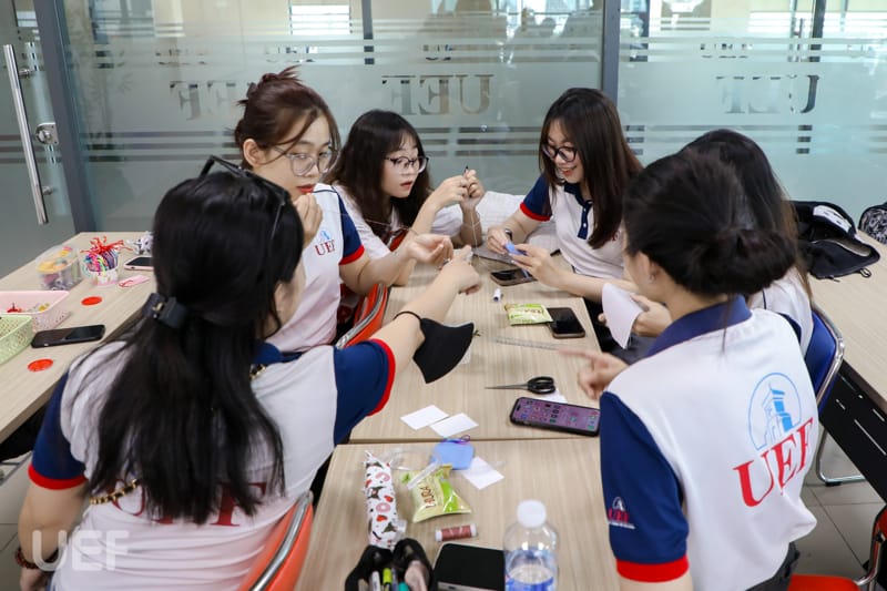 Tiếp đến, UEFers được trải nghiệm hoạt động làm túi vải Omamori. Các bạn sinh viên chia ra thành các đội và có khoảng 30 phút để trang trí theo sở thích sau khi được xem video và hướng dẫn trực tiếp từ Ban tổ chức. Dù là lần đầu tiên được trải nghiệm nhưng các bạn sinh viên đã hoàn thành rất tốt, tạo được nhiều sản phẩm mang màu sắc riêng của mình. Bên cạnh việc trao tặng những lời yêu thương cho người thân, các bạn còn có thể mang về thật nhiều niềm vui và trải nghiệm giá trị qua hoạt động đặc biệt này.
