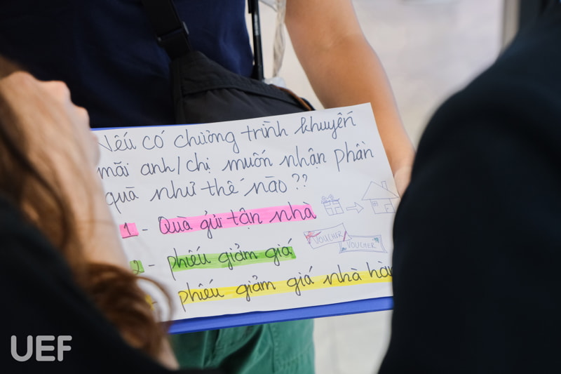 Sinh viên UEF và Nhật Bản chia thành nhiều nhóm, cùng nhau thực hiện khảo sát thực tế để phân tích thị trường của sản phẩm mà nhóm đã chọn.