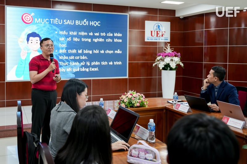 Cũng tại workshop, ThS. Cao Đỗ Quyền mang đến cho sinh viên góc nhìn thực tế về khảo sát và phân tích dữ liệu. Đây là một kỹ năng không thể thiếu trong nghiên cứu hiện đại. Thông qua hướng dẫn cách thiết kế bảng hỏi, chọn mẫu khảo sát và sử dụng Excel để xử lý, trình bày kết quả, sinh viên được rèn luyện tư duy số liệu, biết cách chứng minh lập luận bằng bằng chứng cụ thể. Những điều này sẽ làm nên sự khác biệt giữa quan điểm cá nhân và kết luận khoa học.