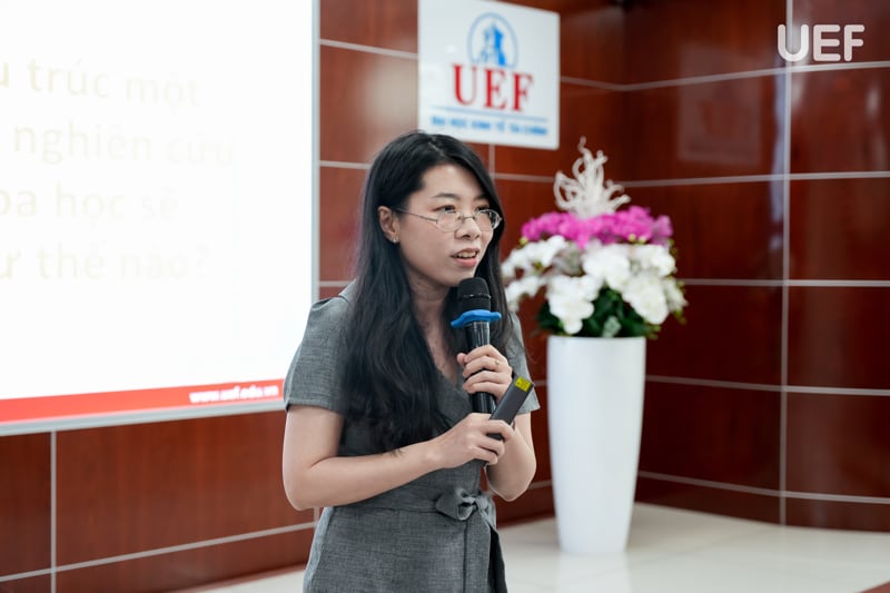 Tiếp nối, ThS. Lý Như Quỳnh giúp sinh viên hiểu sâu hơn về cấu trúc một bài nghiên cứu khoa học hoàn chỉnh và cách xây dựng đề cương mạch lạc, chặt chẽ. Cô nhấn mạnh rằng, một bài nghiên cứu không chỉ là tập hợp của số liệu hay lý thuyết mà là sự phản ánh tư duy logic, khả năng trình bày khoa học và thái độ nghiêm túc của người học. Mỗi biểu đồ, bảng biểu hay trích dẫn đều cần được thể hiện chuẩn xác, mang lại giá trị thực tiễn và tính học thuật cao.