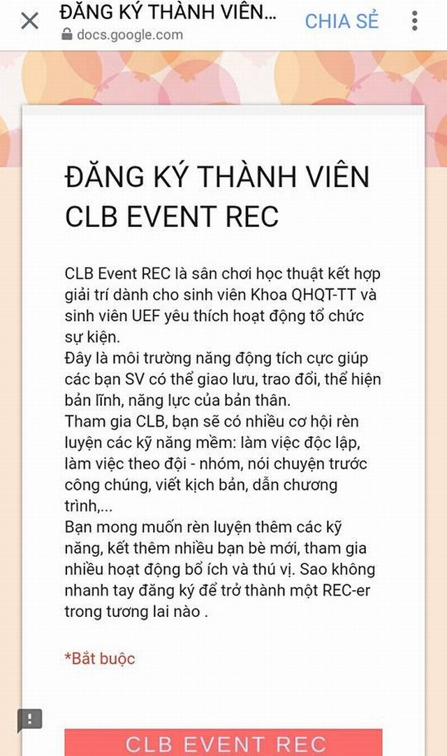 Một góc nhỏ xinh xắn trên tầng 15 là nơi gặp gỡ thú vị giữa các thành viên cũ và mới của CLB Event; là nơi những câu chuyện về các sự kiện được sẻ chia rồi niềm vui từ đó cũng nhân lên gấp bội... CLB Event REC là sân chơi học thuật kết hợp giải trí dành cho sinh viên ngành Quan hệ Công chúng và sinh viên UEF yêu thích hoạt động tổ chức sự kiện. Đây là môi trường năng động tích cực giúp các bạn SV có thể giao lưu, trao đổi, thể hiện bản lĩnh, năng lực của bản thân. Tham gia CLB, bạn sẽ có nhiều cơ hội rèn luyện các kỹ năng mềm: làm việc độc lập, làm việc theo đội - nhóm, nói chuyện trước công chúng, viết kịch bản, dẫn chương trình,...
