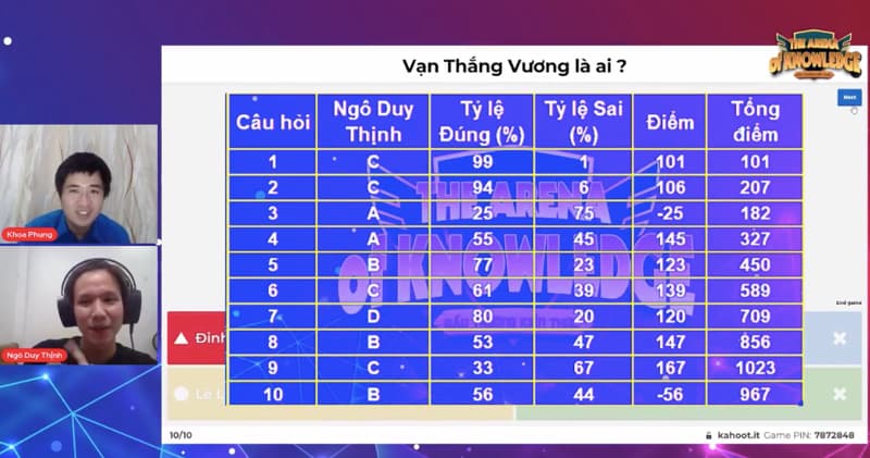 Với vị trí người chơi chính cùng đấu trường hơn 1000 sinh viên tham gia, dù là “tân binh" khóa 2021, Duy Thịnh vẫn tự tin và mang lại năng lượng tích cực cho chương trình. Sau 10 câu hỏi, bạn giành được 967 điểm. Tuy không đạt giải song tinh thần của một tân sinh viên như Duy Thịnh là điều đáng khen và khích lệ.