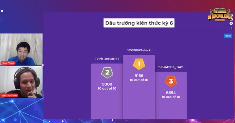 Top 3 bạn có thành tích cao nhất của Đấu trường kiến thức kỳ 6 gồm: Top 1 là 185020847– Shark với 9156 điểm, Top 2 là 205085144 – TVing với số điểm 9008 và Top 3 là 195140213 – Tâm với 8654 điểm. Mỗi bạn sẽ nhận được một phần quà từ Ban tổ chức.