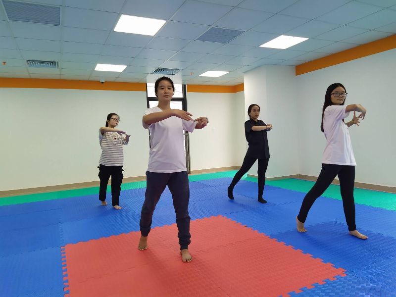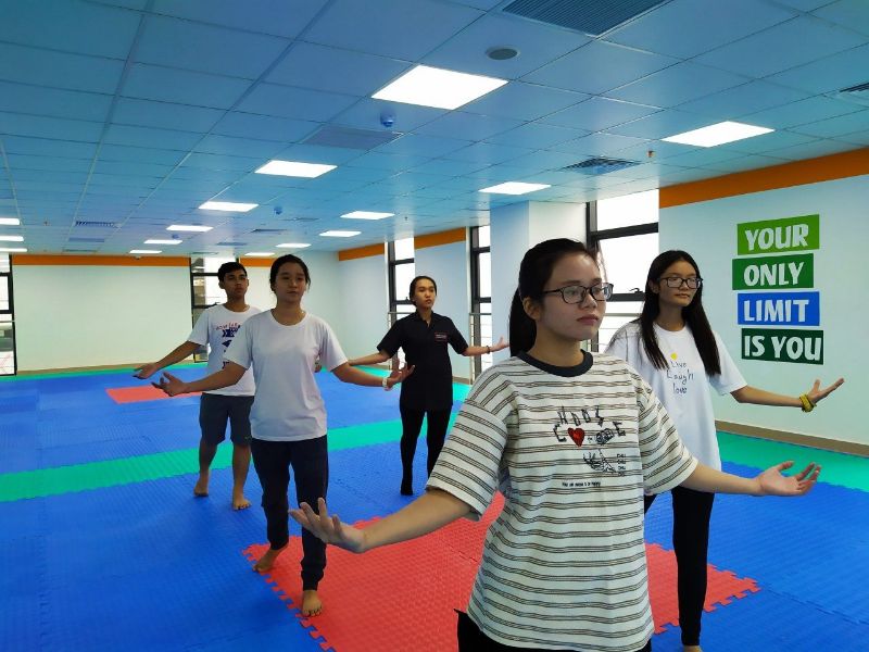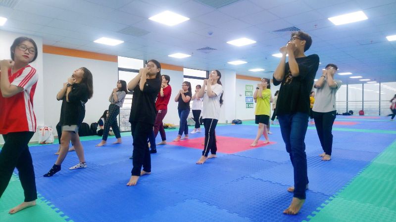 Sinh viên Khóa 19 tập nhảy flashmob dưới sự hướng dẫn của đàn anh Hoài Văn – Chủ nhiệm CLB Hunter Cheerleading tại lầu 22, cơ sở 141
