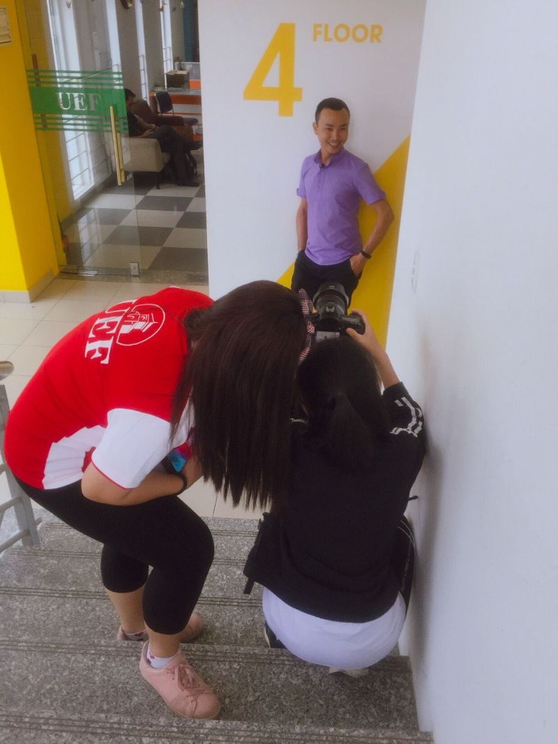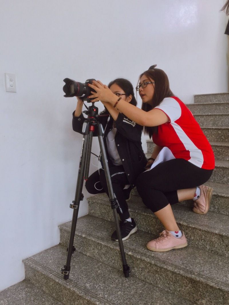 Trân Trân và Ánh Xuân đang ghi hình Thầy Phan Bảo Giang