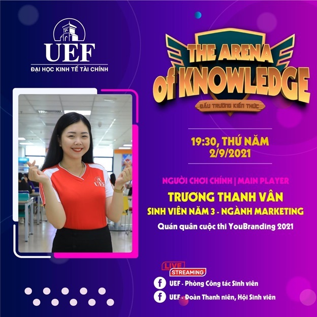 Trong số phát sóng tiếp theo vào 19g30 Thứ Năm ngày 2/9 tới đây, các bạn sẽ được tham gia cùng người chơi chính là bạn Trương Thanh Vân, sinh viên năm 3, ngành Marketing. Đây chính là Quán quân sân chơi xây dựng thương hiệu cá nhân “YouBranding 2021” vừa rồi.