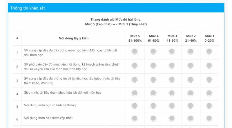 Bước 4. Tại trang thông tin khảo sát, chọn mục tương ứng theo thang đánh giá.