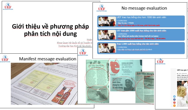 Trong buổi giảng thử, giảng viên Hoàng Mi của Khoa QHQT-TT, đã giới thiệu một phần của môn học, đó chính là phương pháp phân tích nội dung. Do môn học này dự kiến sẽ dành cho sinh viên năm 3 tại trường UEF, thời điểm dự kiến sinh viên tại đây đã có thể sử dụng tiếng Anh một cách thuần thục trong học tập, nên tiết giảng được tiến hành bằng cả tiếng Anh và tiếng Việt. Ngoài ra, phương pháp này cũng được ứng dụng thử phương pháp này với một số tin mới trên các báo như tin về sự tham dự của vận động viên Ánh Viên tại giải vô địch quốc gia hay thông tin nhiễu về nước mắm nhiễm asen gần đây. Buổi học thử này đã nhận được nhiều câu hỏi của sinh viên xung quanh các vấn đề chuyên môn cũng như các vấn đề thời sự trong truyền thông.