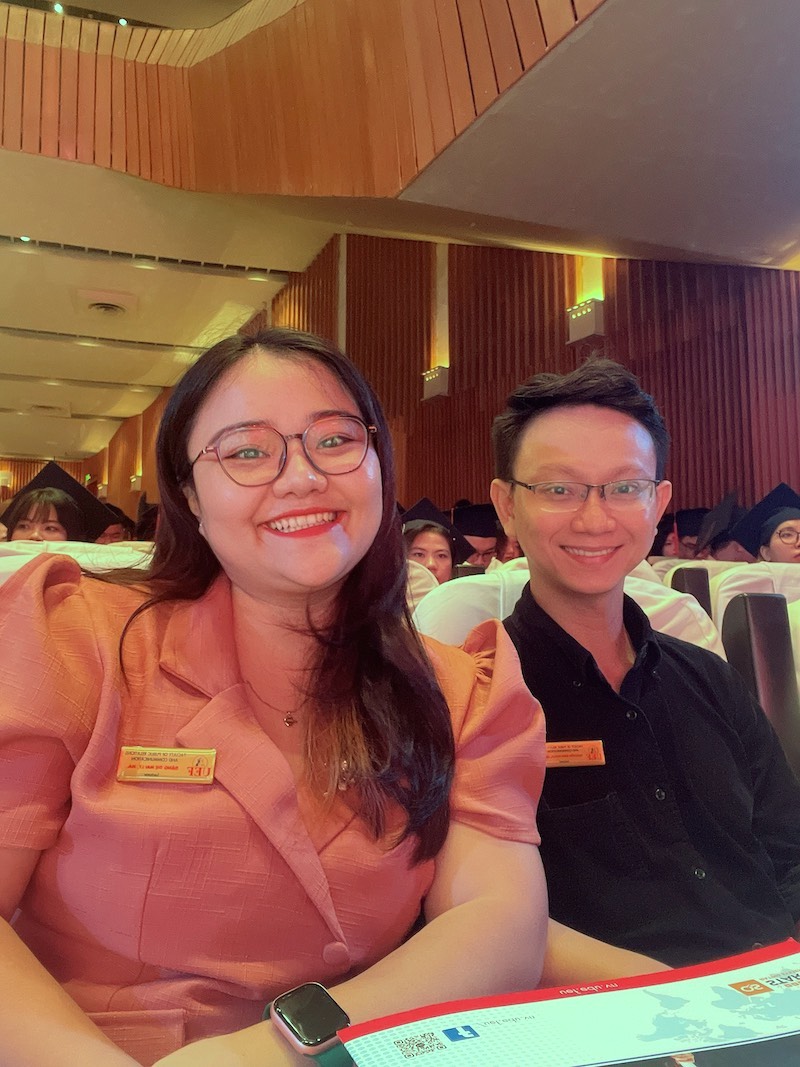 Tân cử nhân Võ Lê Thảo Nhi không bỏ lỡ cơ hội tạo dáng cùng TS. Đặng Anh Lực - Phó Trưởng khoa QHCC-TT khi lên nhận bằng