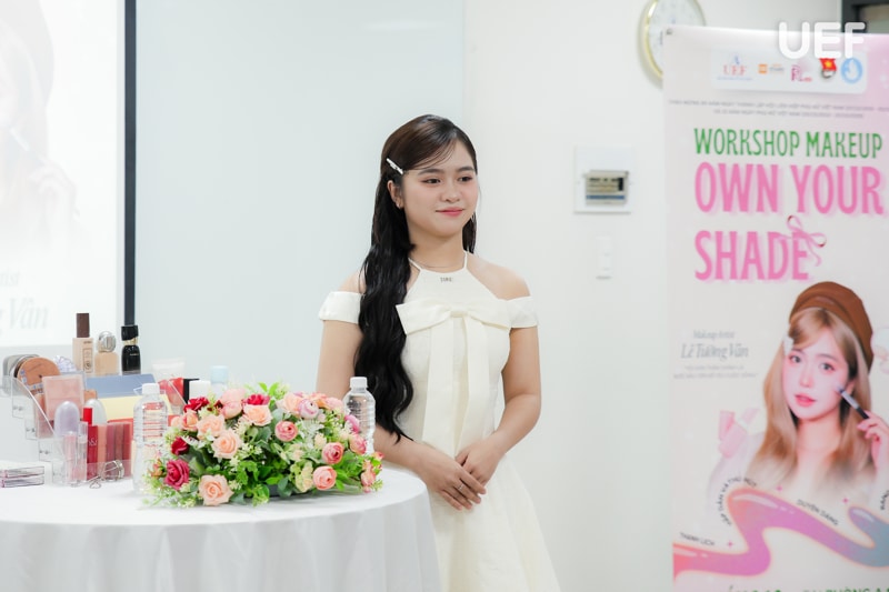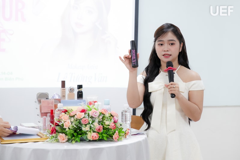 Tiếp theo, chị Tường Vân đã chia sẻ về cách chọn sản phẩm makeup và thứ tự sử dụng tối ưu. Diễn giả hướng dẫn các bước trang điểm tùy thuộc vào thời gian cho phép. Dù không có nhiều thời gian, các bạn sinh viên vẫn có thể sở hữu một lớp makeup đẹp, tươi tắn, chỉ bằng việc tập trung vào những bước thiết yếu. Những bí quyết này giúp UEFers luôn giữ được vẻ ngoài chỉn chu và tự tin trong mọi hoàn cảnh.