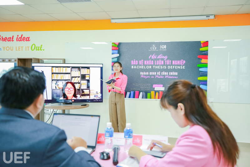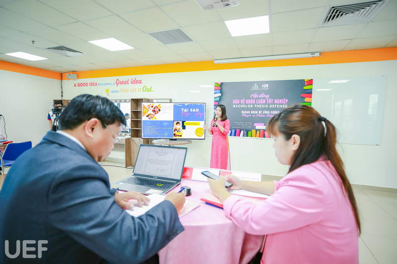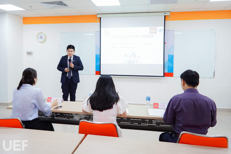Khóa luận tốt nghiệp là thành quả sau 4 năm cố gắng nỗ lực học tập, nghiên cứu của các bạn tại UEF. Tại buổi bảo vệ, mỗi sinh viên có 10 đến 15 phút để trình bày tóm tắt nội dung đề tài, phương pháp nghiên cứu và đề ra giải pháp, sau đó lắng nghe nhận xét và trả lời câu hỏi của Hội đồng đánh giá.