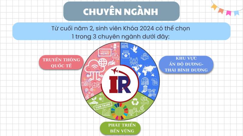 Từ năm 2024, Khoa Quan hệ Quốc tế đã phát triển và bao gồm 03 chuyên ngành hẹp: Phát triển bền vững, Truyền thông quốc tế, Khu vực Ấn Độ Dương - Thái Bình Dương