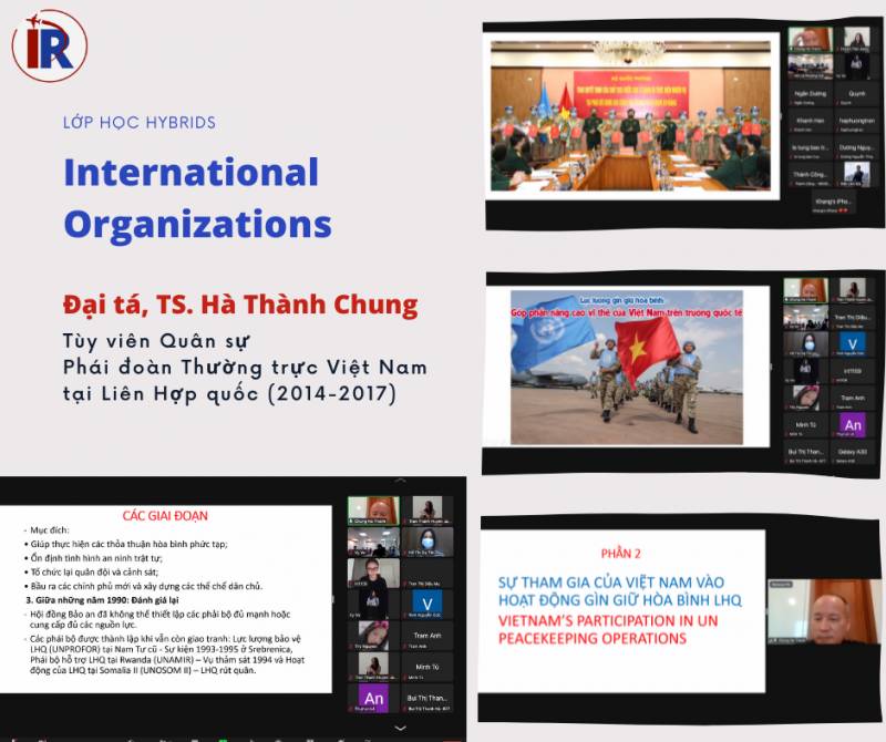 Vừa qua, Khoa Quan hệ Quốc tế đã tổ chức thành công 02 buổi học trong môn Các Tổ chức Quốc tế, với sự xuất hiện và tham gia giảng dạy của Đại tá, TS. Hà Thành Chung - Tùy viên Quân sự, Phái đoàn Thường trực Việt Nam tại Liên Hợp quốc (2014-2017), Nguyên Phó Trưởng Phòng Đào tạo, Học viện Khoa học Quân sự, Bộ Quốc phòng.