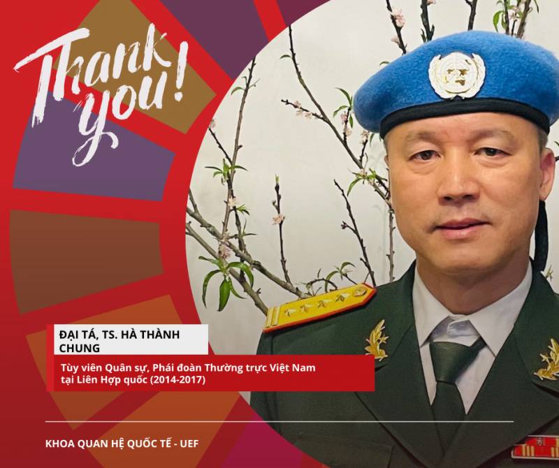 Khoa Quan hệ Quốc tế xin chân thành cảm ơn sự quan tâm, hiện diện của Đại tá, TS. Hà Thành Chung, Tùy viên Quân sự, Phái đoàn Thường trực Việt Nam tại Liên Hợp quốc (2014-2017) trong môn học Các tổ chức Quốc tế. Kính chúc Đại tá sức khỏe và công tác tốt.