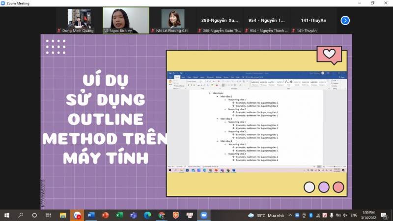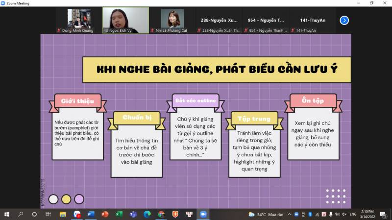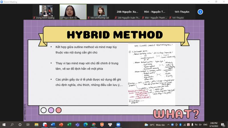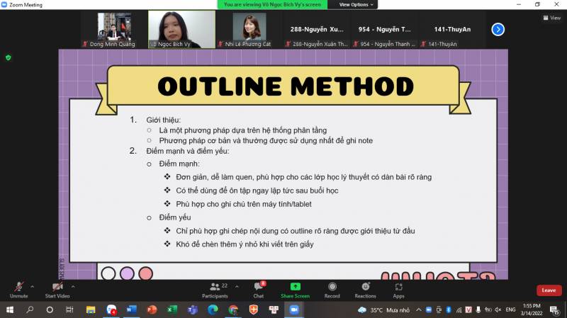 Tiếp đó, ThS Võ Ngọc Bích Vy đã chia sẻ cùng các bạn sinh viên 02 ý chính là: phương pháp ghi chép bài hiệu quả và một số tips cần lưu ý trong quá trình ghi chép. Phương pháp ghi chép được cô Bích Vy giới thiệu là: outline method, hybrid method và mindmap method. Outline là cách ghi chép theo hệ thống phân tầng, được sử dụng phổ biến. Phương pháp này có một số điểm mạnh như: đơn giản, dễ làm quen, phù hợp cho các lớp học lý thuyết có dàn bài rõ ràng; có thể dùng để ôn tập ngay sau buổi học; tối ưu khi thực hiện trên ứng dụng công nghệ. Tuy nhiên, phương pháp này chỉ phù hợp khi giảng viên cho biết outline ngay từ đầu và sinh viên sẽ gặp khó khăn nếu muốn chèn thêm ý khi viết trên giấy.