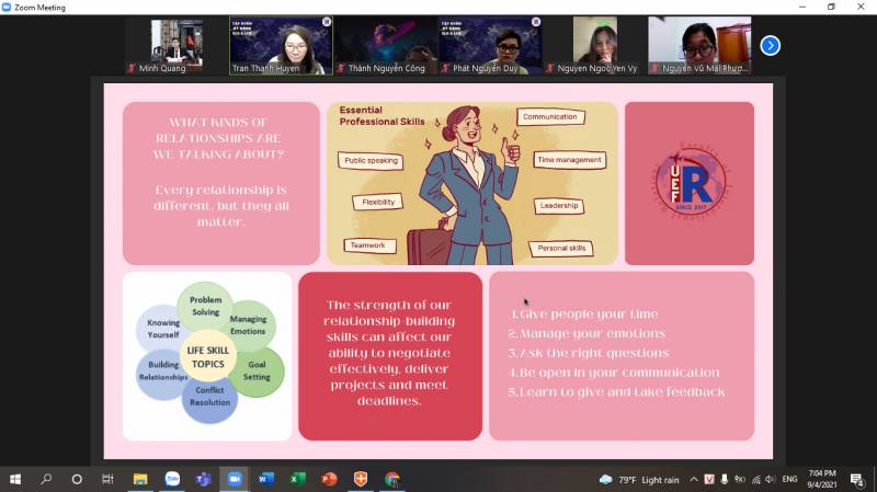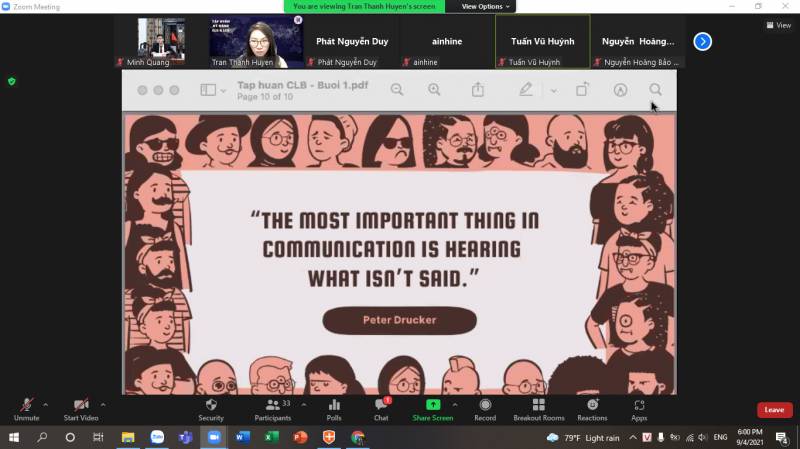 Buổi tập huấn đầu tiên diễn ra vào lúc 18g00, thứ Bảy, ngày 04/09/2021 bằng hình thức trực tuyến qua nền tảng Zoom. Thành phần tham dự gồm có: BCN K. Quan hệ Quốc tế; Khách mời là anh Nguyễn Duy Phát - Cựu sinh viên Khoa Quan hệ Quốc tế Khoá K17, Trainee mảng Change Management, Dự án Chuyển đổi số, Công ty TNHH Thành Thành Công - Biên Hoà; Cố vấn CLB IRC, IRE, IRG và LCĐ; sinh viên là Ban chủ nhiệm, thành viên CLB, Ban chấp hành và CTV của LCĐ