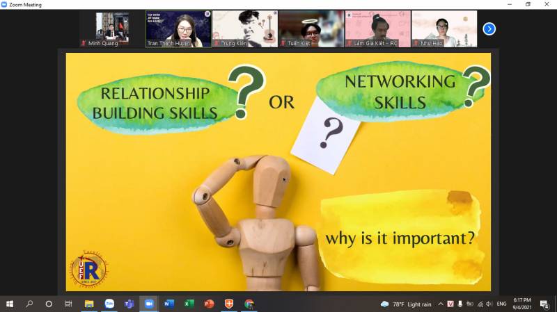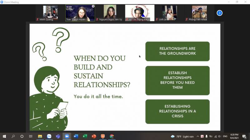 Diễn giả chia sẻ trong buổi tập huấn là TS. Trần Thanh Huyền, Trưởng Khoa, Khoa Quan hệ Quốc tế. Mở đầu, TS. Trần Thanh Huyền, đã đặt ra vấn đề về sự khác nhau giữa (kỹ năng thiết lập mối quan hệ - relationship building skills) và (kỹ năng hình thành mạng lưới - networking skills)