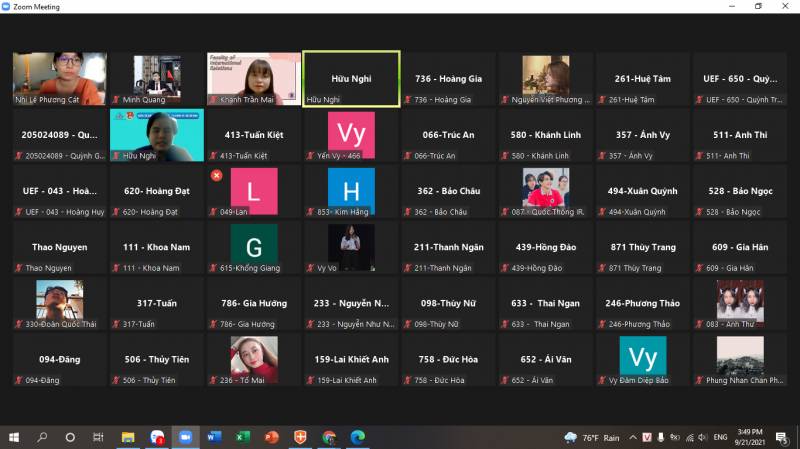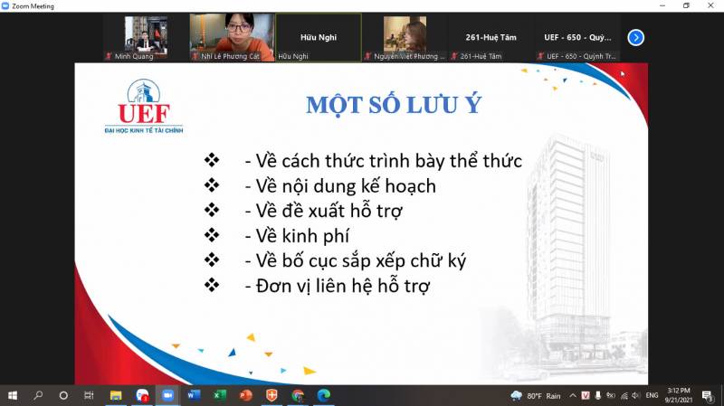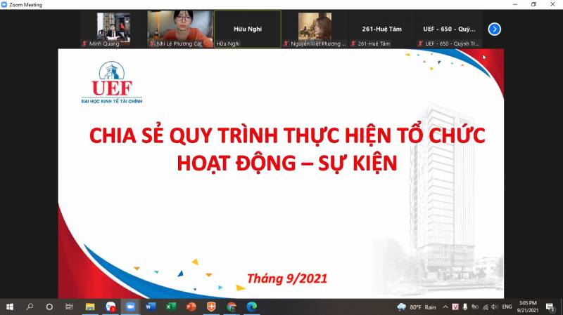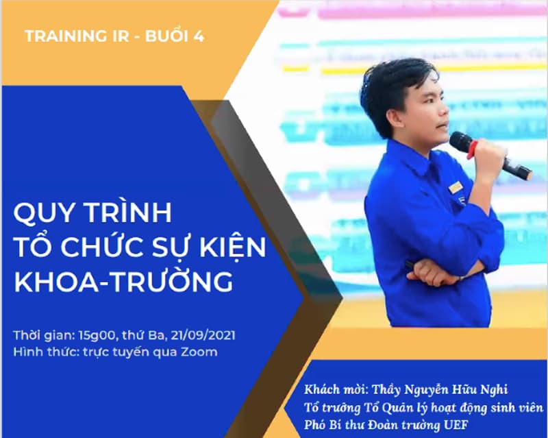 Buổi training diễn ra vào lúc 15g00, thứ Ba, ngày 21/09/2021 qua hình thức trực tuyến qua nền tảng Zoom. Thành phần tham dự tập huấn gồm có CB-GV-NV Khoa Quan hệ Quốc tế, Ban chủ nhiệm các CLB, Ban chấp hành Liên Chi Đoàn; Các sinh viên là thành viên CLB và cộng tác viên của Liên Chi Đoàn có nguyện vọng ứng tuyển vào BCN-CLB và BCH-LCĐ. Diễn giả của buổi chia sẻ là Thầy Nguyễn Hữu Nghi, Tổ trưởng Tổ Quản lý hoạt động sinh viên, Phó Bí thư Đoàn trường Đại học Kinh tế - Tài chính, TPHCM (UEF)