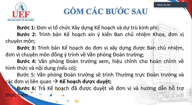 Bước 3: Trình bản kế hoạch cho đơn vị xây dựng được Ban chủ nhiệm, đơn vị chuyên môn đồng ý trình về Văn phòng Đoàn trường;