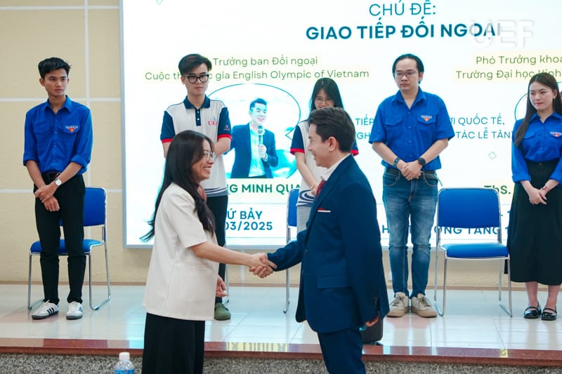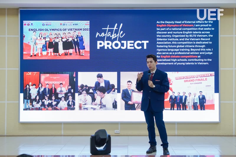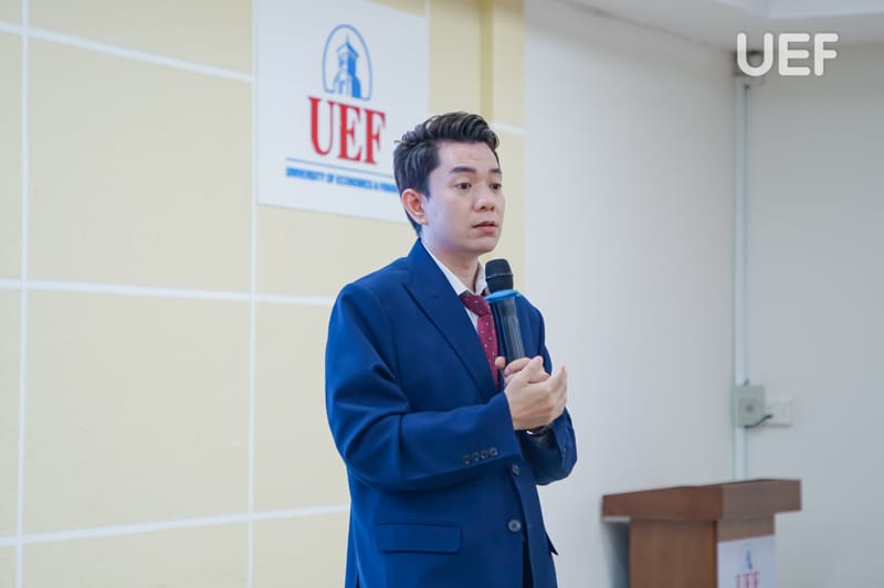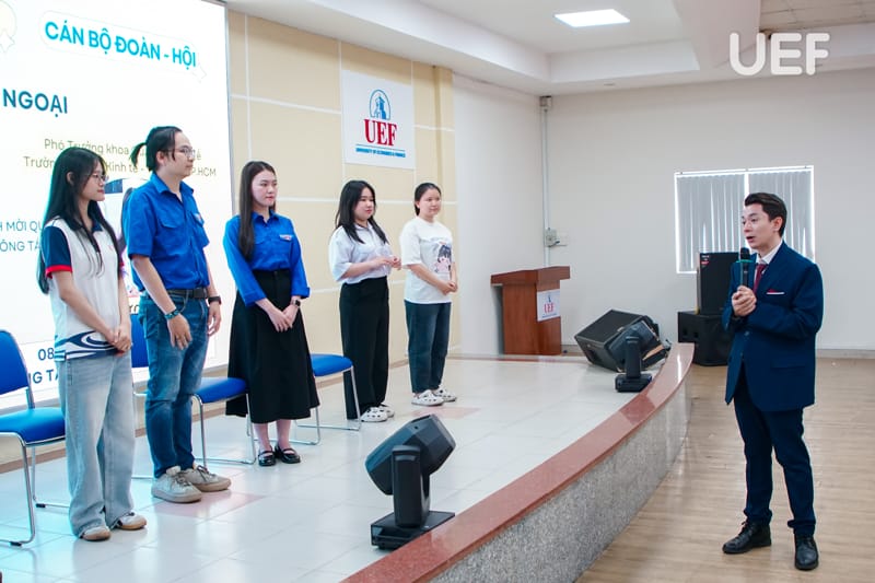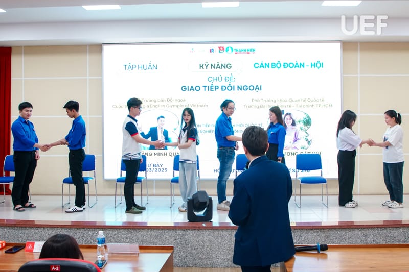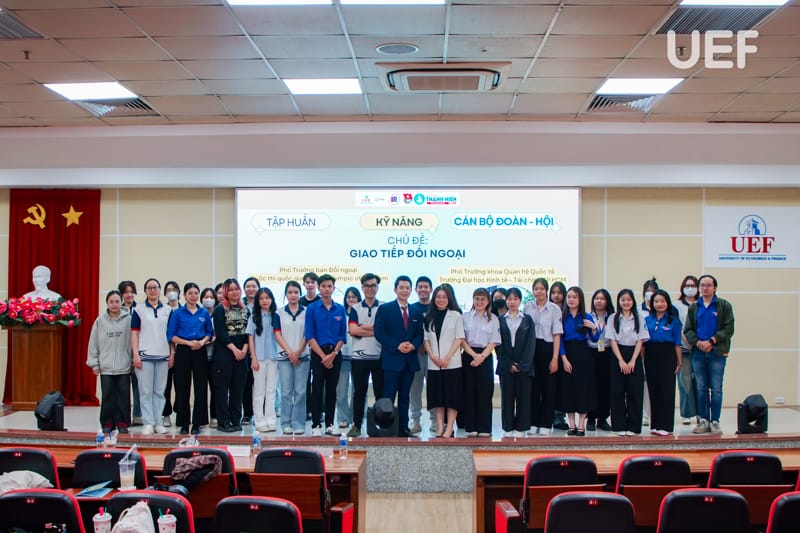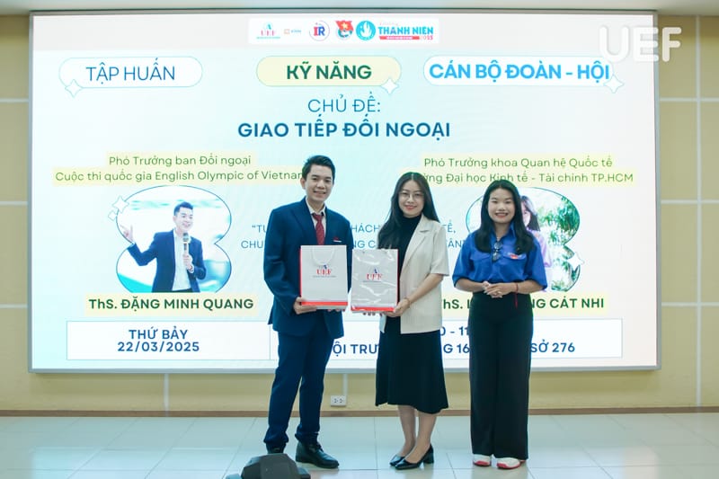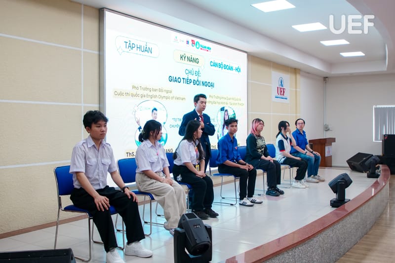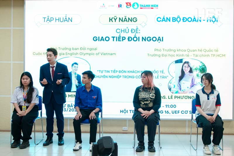 Chương trình giúp UEFers nâng cao kỹ năng giao tiếp và xử lý tình huống chuyên nghiệpDiễn giả của buổi tập huấn là ThS. Đặng Minh Quang - Phó Trưởng ban Đối ngoại của cuộc thi quốc gia English Olympic of Vietnam. Đồng hành với khách mời và sinh viên là ThS. Lê Phương Cát Nhi - Phó Trưởng khoa Quan hệ quốc tế.
