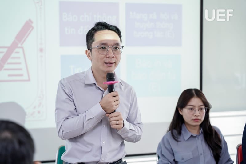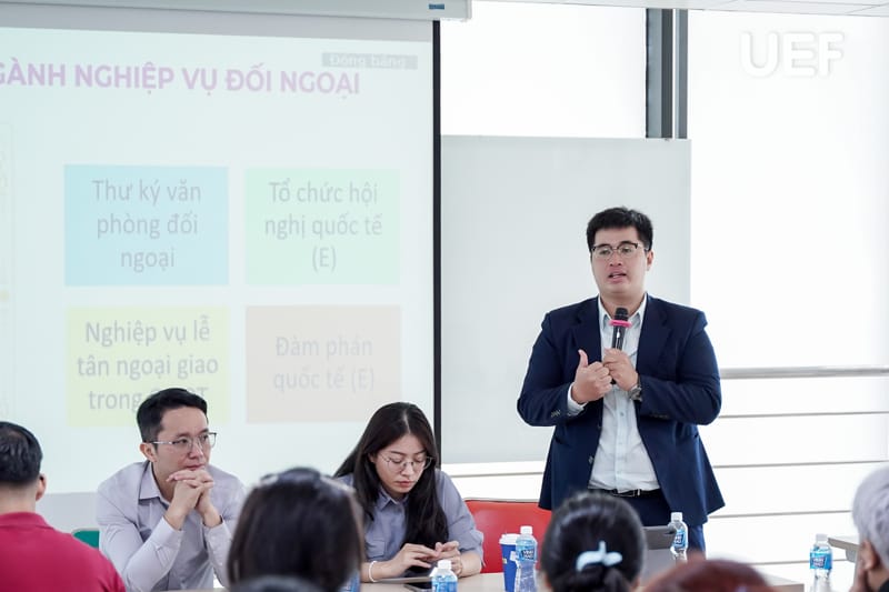 Tham gia buổi định hướng, sinh viên được lắng nghe chia sẻ của Nhà báo Đỗ Thiện - Trưởng ban Truyền hình - Đa nền tảng báo Pháp Luật TP.HCM, cựu sinh viên Khoa Quan quốc tế trường Đại học KHXH&NV TP.HCM; anh Phùng Tiến Khoa - Cán bộ Đối ngoại thanh niên quốc tế tại Thành Đoàn TP.HCM, cựu sinh viên Khoa Quan hệ quốc tế UEF cùng các giảng viên Khoa. Đại diện Khoa Quan hệ quốc tế tham dự có TS. Đào Minh Hồng - Trưởng khoa, ThS. Lê Phương Cát Nhi - Phó Trưởng khoa.