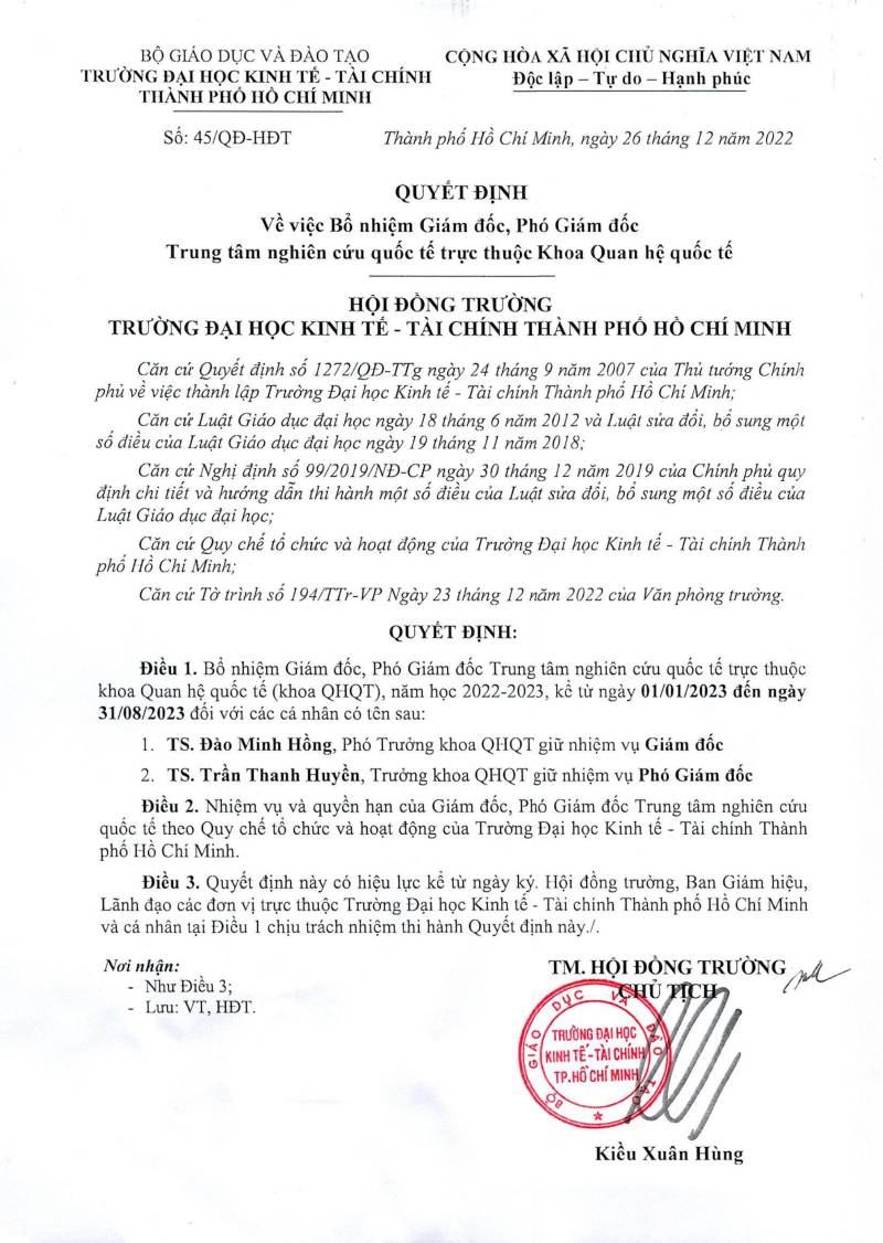 Căn cứ theo quyết định số 44 và 45/QĐ-HĐT của Chủ tịch Hội đồng Trường Đại học Kinh tế - Tài chính TPHCM, ngày 26 tháng 12 năm 2022, theo đó: