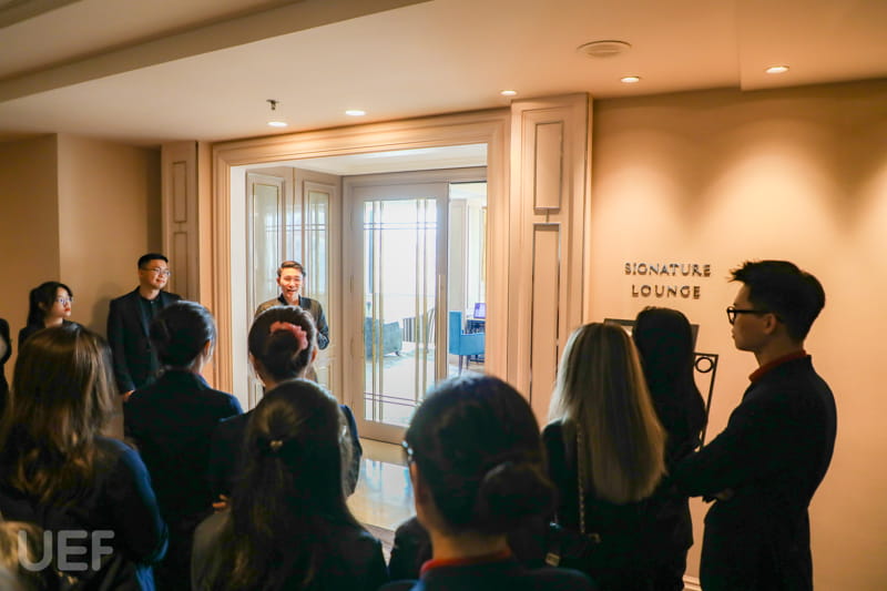Các hoạt động tham quan môi trường làm việc thực tế sẽ giúp các bạn sinh viên tích lũy kinh nghiệm, trau dồi kiến thức chuyên ngành cũng như bồi đắp thêm động lực theo đuổi những vị trí công việc triển vọng. Với tinh thần này, chiều ngày 14/3, Khoa Quản trị du lịch – Khách sạn UEF đã tổ chức buổi tham quan tại một trong những khách sạn 5 sao đẳng cấp quốc tế – Khách sạn Caravelle Sài Gòn cho các bạn sinh viên. Chuyến đi này nằm trong chuỗi chương trình "FTHM to Hotel".