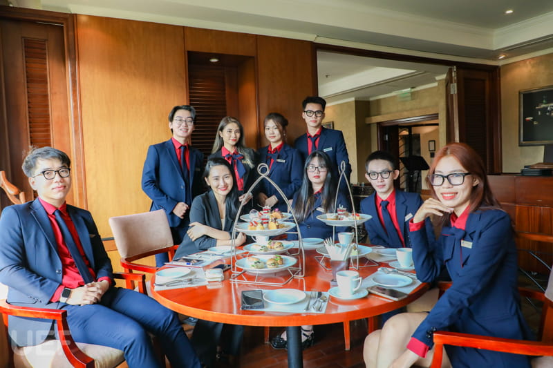 Trong quá trình tham quan, các bạn sinh viên còn được trải nghiệm tiệc trà chiều nhẹ từ phía khách sạn chuẩn bị. Không chỉ có hình thức đẹp mắt, set trà chiều tại đây còn chinh phục vị giác của các bạn sinh viên bằng hương vị thơm ngon của đa dạng các loại bánh mặn – ngọt được bày trí vô cùng ấn tượng.