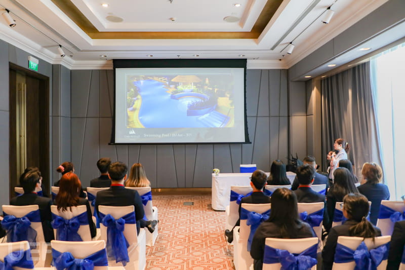 Khởi động buổi hotel tour, chị Bích Hà – Giám đốc Bộ phận nhân sự khách sạn Caravelle Sài Gòn giới thiệu đến sinh viên UEF đôi nét về lịch sử hình thành và phát triển, những giá trị cốt lõi, sứ mệnh, tầm nhìn, những chương trình hoạt động xoay quanh con người và cộng đồng đã và đang được khách sạn thực hiện. Từ đây, sinh viên hiểu hơn lý do Khách sạn Caravelle là một trong những khách sạn 5 sao lâu đời và nổi tiếng bậc nhất thành phố. Caravelle Sài Gòn mang đậm màu sắc lịch sử nhưng vẫn đảm bảo được sự hiện đại và sang trọng, trở thành lựa chọn dừng chân của nhiều du khách.