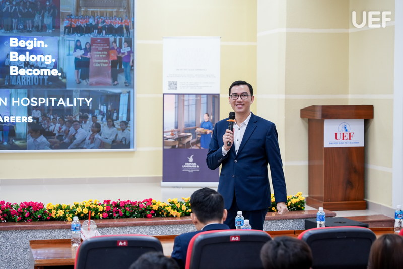 Phần chính của chương trình là chia sẻ đến từ ông Duy Phan - Cluster Learning and Development Manager, Vinpearl Landmark 81 Autograph Collection. Với góc nhìn “người trong cuộc”, ông Duy Phan đã phân tích cơ cấu thị trường ngành khách sạn hiện nay, chỉ ra các nhánh nghề phong phú trong ngành. Thông qua ví dụ về hệ sinh thái thương hiệu Marriott, sinh viên được hình dung rõ chuỗi giá trị nghề nghiệp, cùng những vị trí thực tập và cơ hội nghề nghiệp hấp dẫn mà tập đoàn đối tác có thể cung cấp cho UEFers.