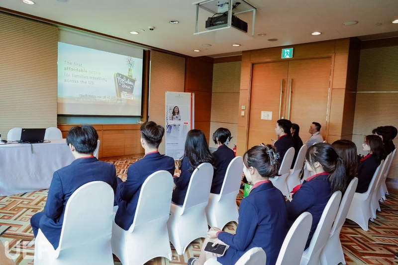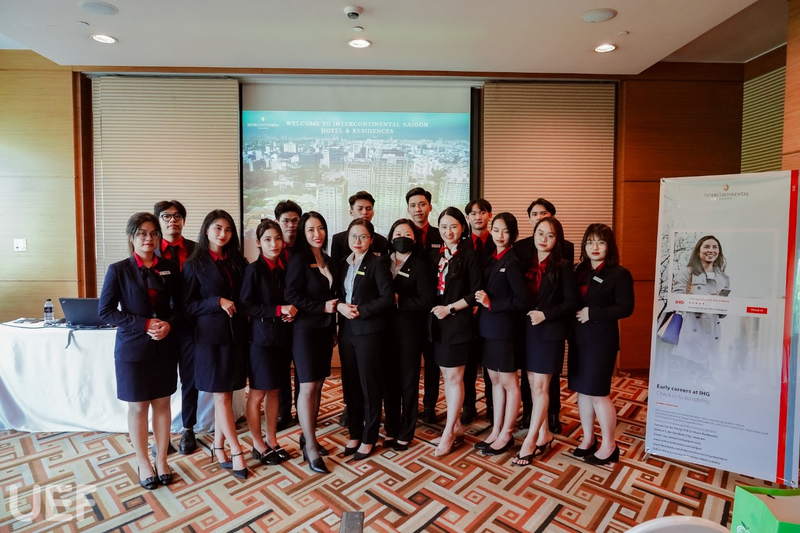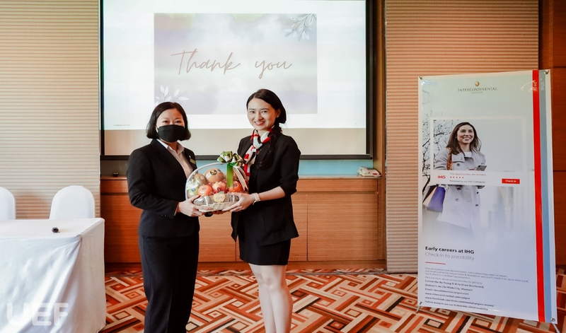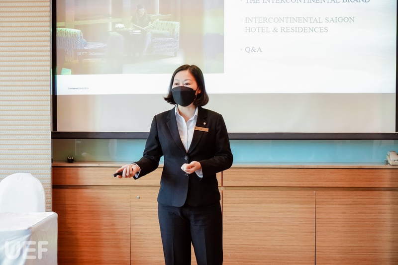 Sau khi được trang bị thông tin về các khu vực ở khách sạn, sinh viên UEF được chị Nhân Ái – Trưởng phòng Nhân sự giới thiệu về lịch sử của tập đoàn InterContinental Hotels Group (IHG), số lượng nhân viên, định hướng trong tương lai, phân khúc khách hàng,... Chị còn giải đáp thắc mắc do các bạn sinh viên đặt ra và mong muốn sau này sẽ được tiếp đón UEFers với tư cách là thực tập sinh tại InterContinental.