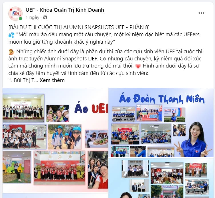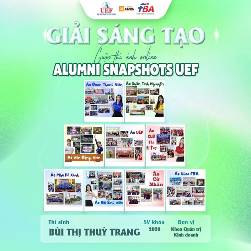 Trong tháng 7 vừa qua, Khoa Quản trị kinh doanh UEF đã phát động cuộc thi ảnh trực tuyến: Alumni Snapshots UEF nhằm tạo cơ hội cho cựu sinh viên trao gửi tình cảm và những kỷ niệm đáng nhớ trong quãng thời gian học tập tại trường. Không chỉ đóng vai trò quan trọng trong việc khơi gợi lòng tự hào của mỗi cựu UEFer mà hoạt động còn là cầu nối gắn kết giữa các thế hệ sinh viên - những người đã cùng trưởng thành và phát triển dưới mái nhà chung này.