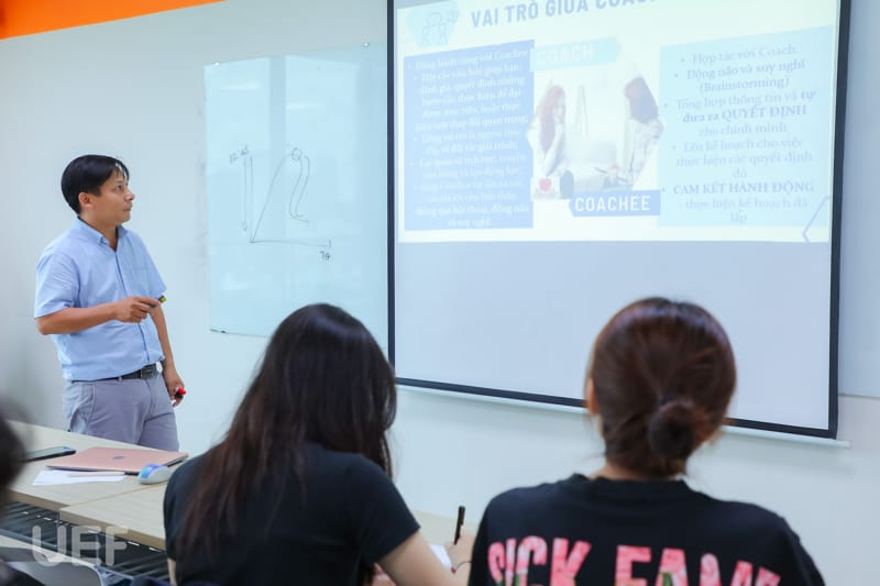 Với chủ đề về Coaching, hai diễn giả đã giúp sinh viên hiểu được khái niệm, phân biệt giữa coaching - mentoring - training, vai trò của coaching và các kỹ năng cần thiết của coaching.