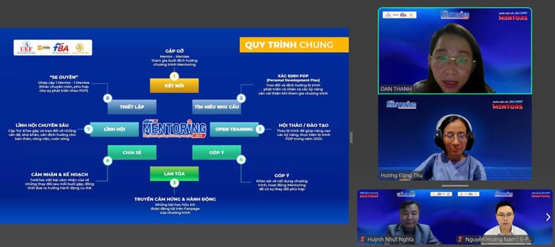 Buổi gặp gỡ cũng giới thiệu cơ cấu tổ chức chuyên nghiệp của dự án, với sự phân công rõ ràng giữa các tiểu ban: Cố vấn, Điều phối, Giám sát, Sự kiện và truyền thông, nhằm đảm bảo lộ trình diễn ra hiệu quả, liên tục và sát với nhu cầu thực tế. Các Mentors cũng được phổ biến chi tiết về cơ chế matching, cách thức xây dựng PDP cùng Mentee, cũng như quy trình ghi nhận tiến độ, phản hồi và đánh giá kết quả.