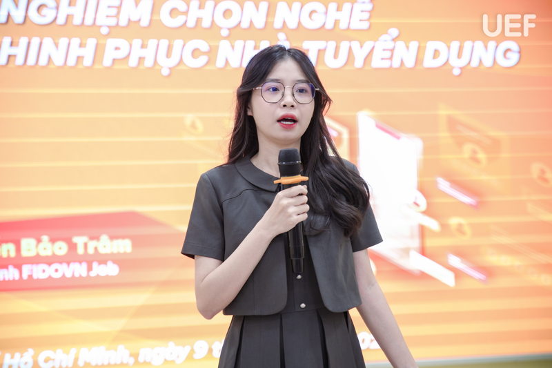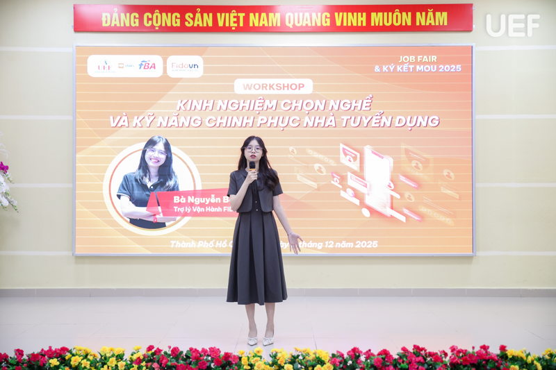 Đặc biệt, trong khuôn khổ ngày hội còn có workshop “Kinh nghiệm chọn nghề và kỹ năng chinh phục nhà tuyển dụng”, thu hút đông đảo sinh viên tham dự. Diễn giả Nguyễn Bảo Trâm - Trợ lý vận hành FIDOVN Job, đã chia sẻ những thông tin quan trọng về thị trường lao động, các yêu cầu phổ biến trong tuyển dụng thực tập sinh, những khó khăn thường gặp khi sinh viên viết CV hoặc chuẩn bị hồ sơ ứng tuyển. Nội dung workshop đi sâu vào các chiến lược chọn vị trí phù hợp, kỹ thuật đọc hiểu JD, gợi ý khóa học bổ trợ và các nguyên tắc xây dựng CV hiệu quả.