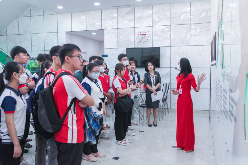 Tham quan nhà máy, cơ sở sản xuất sản phẩm là một trong những nội dung nằm trong chương trình học tập của sinh viên. Qua sự dẫn dắt của ThS. Nguyễn Thanh Mỹ cùng đại diện Nhà máy Yakult Việt Nam, các bạn sinh viên được cung cấp nhiều thông tin về lịch sử hình thành, giá trị dinh dưỡng của sản phẩm sữa Yakult, chứng kiến quy trình sản xuất nghiêm ngặt áp dụng công nghệ và máy móc hiện đại đến từ Nhật Bản.