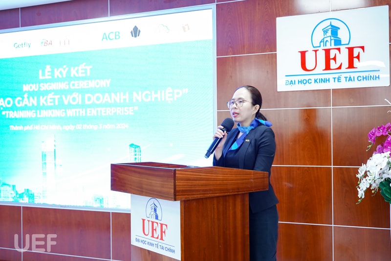Đại diện các doanh nghiệp, bà Phạm Trương Hoàng Oanh - Giám đốc ACB chi nhánh Tân Bình bày tỏ niềm vinh dự khi doanh nghiệp là đối tác của trường trong hơn 10 năm nay. “Sau 10 năm, số lượng sinh viên của UEF “gia nhập” ACB đã tăng lên gấp 20 lần, quá trình rực rỡ đó là nhờ sự nỗ lực của các bên. UEF có những cải tiến nổi bật trong đào tạo, cơ sở vật chất. Sinh viên trường có thái độ và kỹ năng tốt so với mặt bằng chung của các bạn khối ngành kinh tế” - bà Oanh chia sẻ.