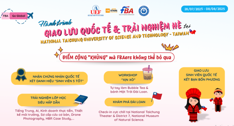 Nhằm tiếp tục khẳng định vị thế là trường đại học song ngữ năng động, hiện đại, tăng cường cầu nối quốc tế và mang đến cơ hội trải nghiệm học tập từ những trường đại học danh tiếng trên thế giới cho sinh viên, UEF triển khai chương trình giao lưu quốc tế năm 2025 tại Trường Đại học Quốc lập Khoa học Công nghệ Đài Trung (NUTC), Đài Loan. Đây là hoạt động thường niên mang đậm dấu ấn hội nhập, giúp sinh viên mở rộng kiến thức và trải nghiệm thực tế trong môi trường giáo dục tiên tiến. Chương trình do Viện Quốc tế và Khoa Quản trị kinh doanh chủ trì thực hiện.