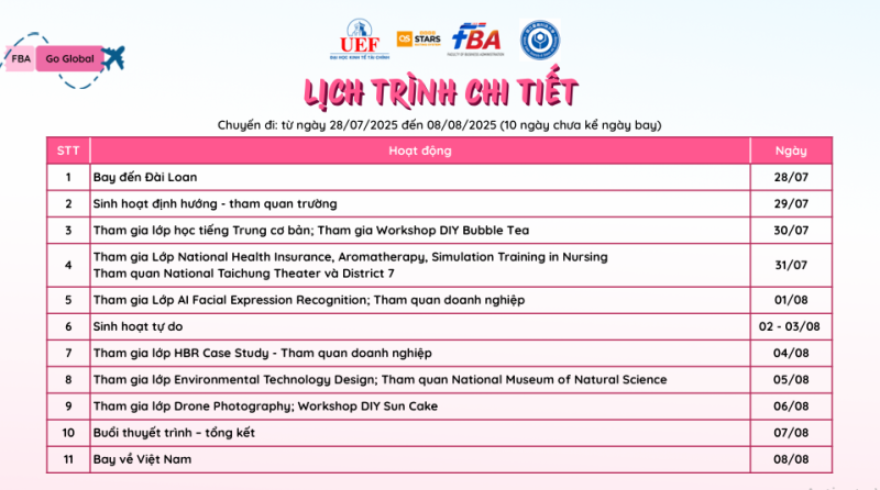 Chương trình năm nay diễn ra từ ngày 28/7 đến 8/8/2025, với lịch trình học tập và tham quan kéo dài 10 ngày. Sinh viên tham gia sẽ có cơ hội trực tiếp khám phá đời sống học đường tại Đài Loan qua các lớp học tiếng Trung cơ bản, workshop pha chế Bubble Tea, khóa học về nhận diện khuôn mặt bằng AI, thiết kế công nghệ môi trường, nhiếp ảnh bằng drone, cùng nhiều hoạt động thú vị khác.