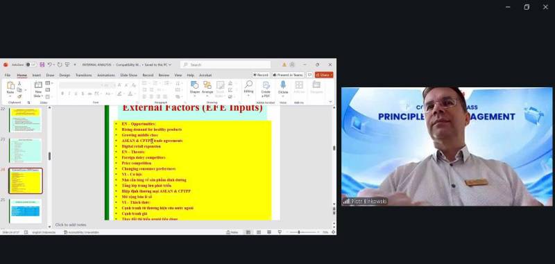 Buổi đồng giảng tập trung vào chủ đề quan trọng: Internal & External Analysis – hai nền tảng cốt lõi trong quá trình hoạch định chiến lược của doanh nghiệp. Thông qua nhiều khung phân tích chiến lược như đánh giá nguồn lực nội bộ, phân tích môi trường ngành, nhận diện cơ hội – thách thức, sinh viên được tiếp cận cách thức doanh nghiệp trên thế giới và tại Việt Nam áp dụng để điều hướng cạnh tranh và đưa ra quyết định chiến lược hiệu quả.