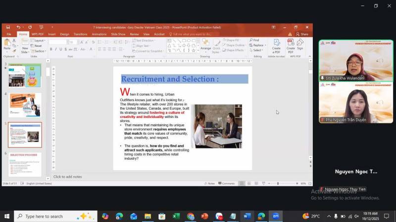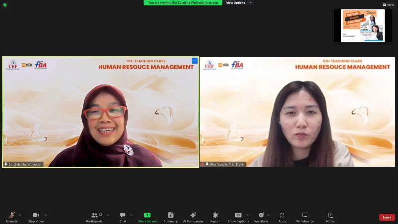 Buổi co-teaching được dẫn dắt bởi hai giảng viên đến từ hai cơ sở giáo dục, đó là Dr. Siti Zulaikha Wulandari, S.E., M.Si - Giảng viên Khoa Kinh tế & Quản trị, UNSOED, Indonesia và ThS. Nguyễn Trần Duyên Phú - Giảng viên Khoa Quản trị Kinh doanh, UEF. Sự kết hợp giữa hai chuyên gia đã mang đến góc nhìn đa chiều về quản trị nguồn nhân lực, giúp sinh viên không chỉ hiểu lý thuyết chuẩn mực mà còn nhận diện được sự khác biệt trong cách tiếp cận tuyển dụng giữa các quốc gia và tổ chức.