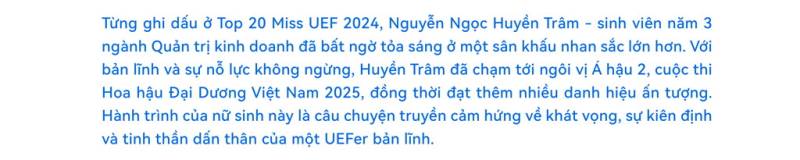 Hành trình vừa qua đã khắc họa một thành tích đáng tự hào của một nữ sinh UEF, trở thành biểu tượng cho sức trẻ, sự tự tin và tinh thần chinh phục của thế hệ sinh viên hôm nay. Tin rằng, từ nền tảng ấy, Huyền Trâm sẽ tiếp tục viết nên những chương mới đầy rực rỡ, lan tỏa những giá trị nhân văn và trở thành nguồn cảm hứng cho nhiều người trẻ dám bước ra khỏi vùng an toàn để tìm thấy “ánh sáng” của riêng mình.