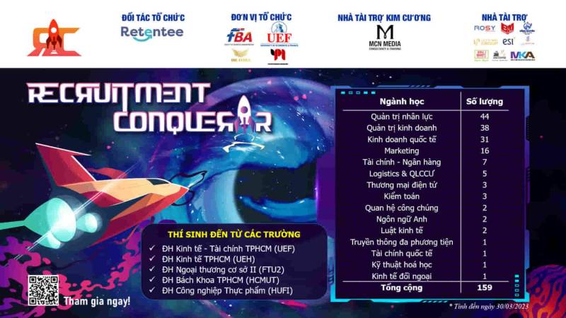 Với sức hút của cuộc thi, dự kiến, số lượng thí sinh đăng ký tham gia vẫn đang tăng lên từng ngày. Hãy nhanh tay đăng ký tham dự “Recruitment Conqueror 2023” trước ngày 9/4 để không bỏ lỡ cơ hội trau dồi những kiến thức thực tiễn liên quan đến lĩnh vực nhân sự, quản lý và phát triển bản thân cùng các kỹ năng mềm khác.
